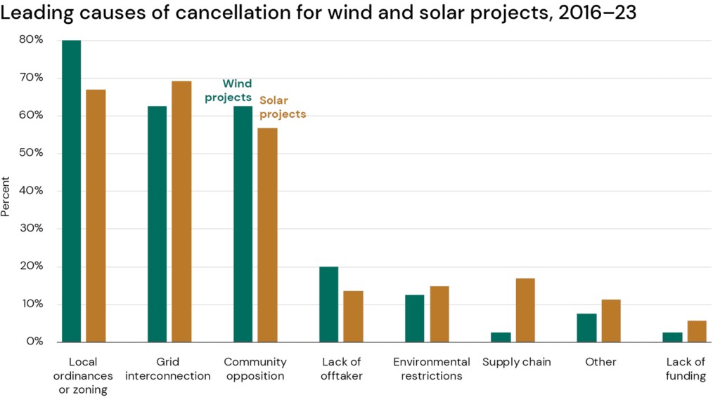 Siting and permitting challenges remain the leading barrier to project setbacks and cancellations. A 2023 survey (graph below) of utility-scale wind and solar developers revealed that the top causes of cancellations over the past five years were unduly restrictive local ordinances, grid interconnection delays, and community opposition.