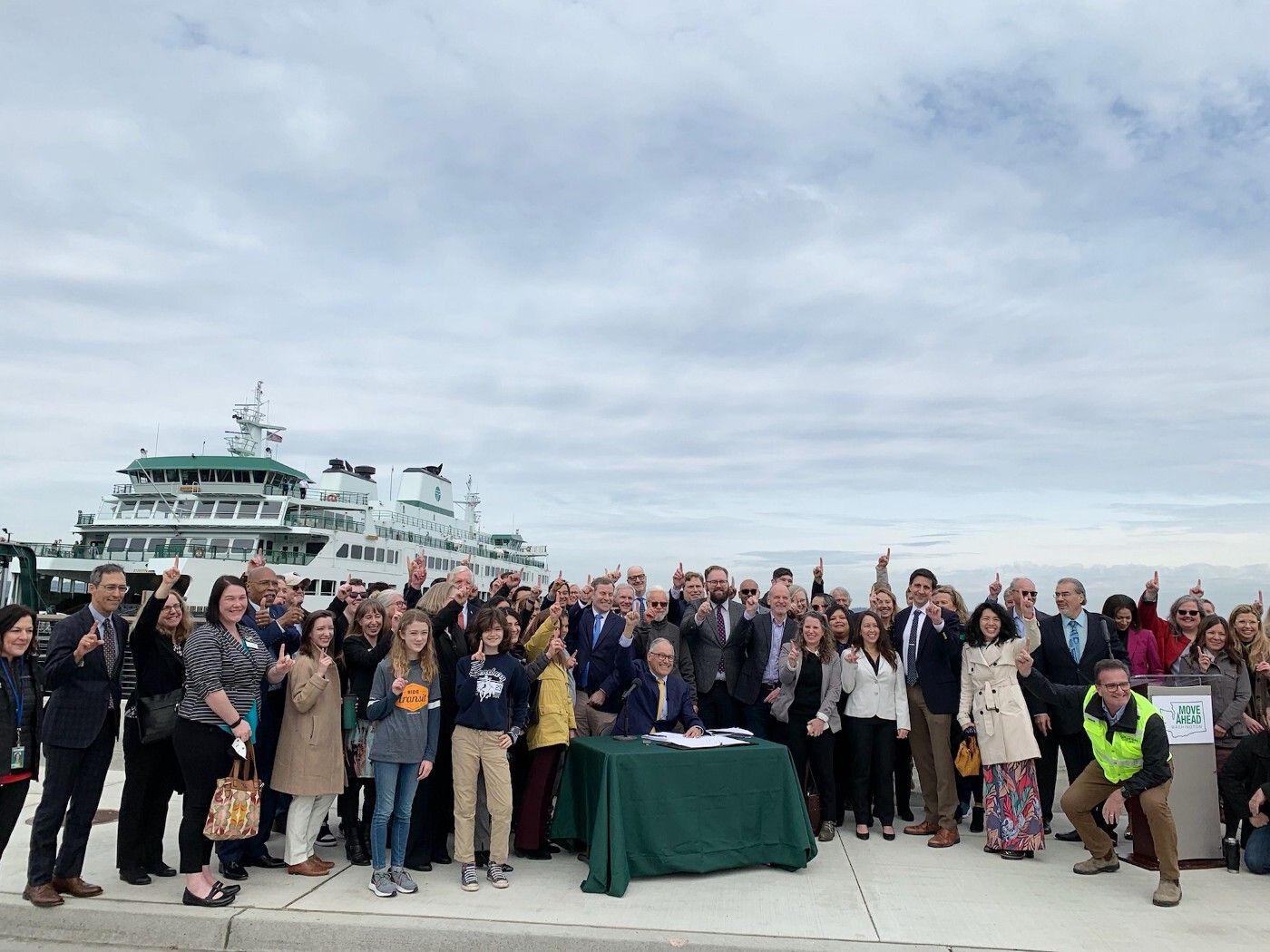 Gov. Jay Inslee celebrates with attendees and speakers at the 2022 bill signing for Move Ahead Washington.