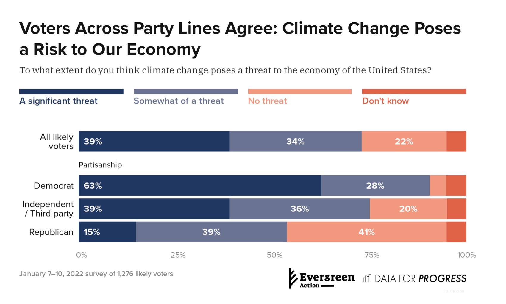 - Roughly three quarters of likely voters think climate change poses a threat to the U.S. economy, including majorities of Democrats, Independents and Republicans.