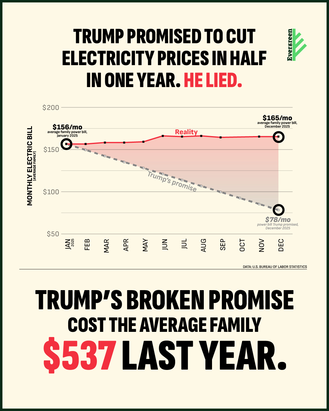 Methodology Footnote: This estimate uses Bureau of Labor Statistics (BLS) data on average residential electricity prices and U.S. Energy Information Administration data on average household electricity use. We calculated the average monthly electricity bill paid by a U.S. household in 2025 by multiplying each month’s average price per kilowatt-hour by average monthly household consumption (875 kWh), then summing those monthly costs across the year. We then calculated a hypothetical scenario in which electricity prices declined linearly from their January 2025 level to 50 percent of that level by December 2025, applying the same consumption assumption. The difference between these two totals shows that the average household paid $537.25 more for electricity in 2025 than it would have under the promised price-cut scenario.